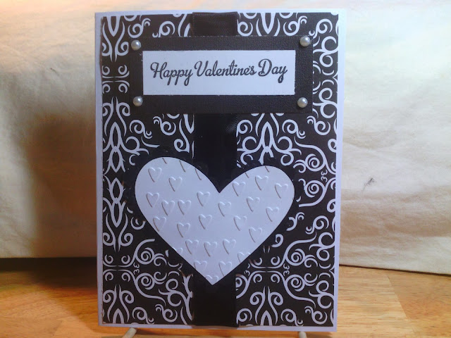 This card was made with doodlecharms at 3 inches. I embossed the heart with my hearts cuttlebug folder. For the sentiment I stamped on white paper, cut it out then cut the black piece a little larger. I added white pearls. My card base is 6.5 x 5. The patterned paper is 6.25 x 4.75. I added black ribbon down the center.