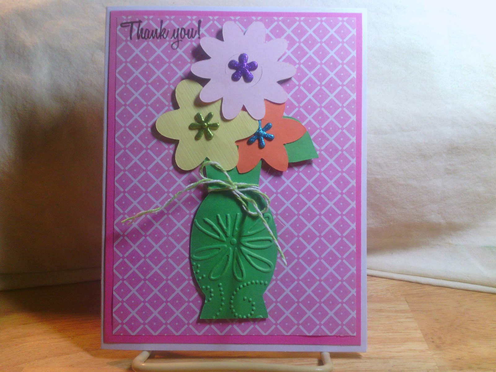 This card was made with Bloom cartridge at 5.5 inches. I embossed the vase, added flower brads and tied a bow. My card base is 6.5 x 5. The pink mat is 6.25 x 4.75. The patterned mat is 6 x 4.5.