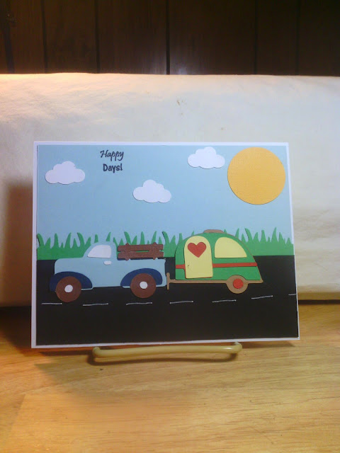 This card was made with Just because and Wild card 2. The truck is from Just because at 3.5 inches. The camper is from Wild card 2 at 2 inches. The clouds were from a punch. The grass also cut from a punch.  The sun is from a circle punch. I got the idea from pinterest when I typed in cricut camping cards.